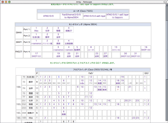ツール自体は単純であり,基幹ルータ (Cisco 7505),センタスイッチ (Alpine 3904),各フロアスイッチ (Cisco 2950/3524XL) のすべてのポートにつき,それを操作パネル的に table のセルで表現し,セルのクリックでトラフィック表示のページへ跳ぶようにしたもの,および,ポートのトラフィックが「グラフの対照」という形で表示されるようにしたものである。