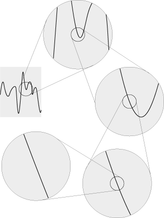 「局所的に線形」は,連続であって角(かど)がない状態,すなわち「なめらか」な状態である。 「なめらか」は,「局所的に線形」の意味で数学用語になっている。