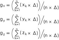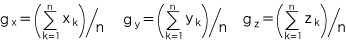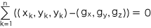 ここで,任意に xyz 直交座標を導入して, G(gx, gy, gz), Pk(xk, yk, zk) (k=1, ‥‥, n) とすれば,上の条件は,つぎのようになります: