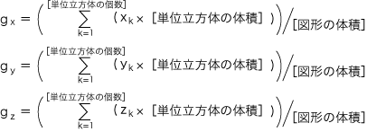 同じ立方体 (「単位立方体」) がn個でなる立体図形Sを考えます。 Sの重心をGとし,各立方体の中心 (重心) をPk とします (k=1, ‥‥, n)。 各Pk には,同じ重力ベクトル F が作用しています。 そこで,Gにおける「重力のモーメントが釣り合う」の条件は,つぎのようになります: