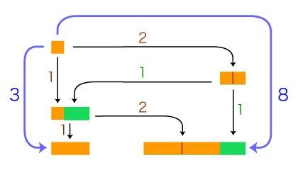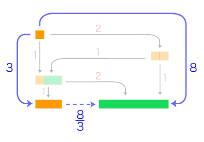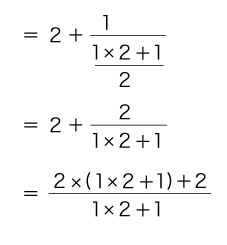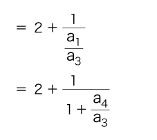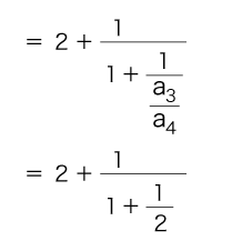 しかしそうではない。 整数比を求める手順がある。 言い換えると,分数を値とするきちんとした測定法がある。 それが,「ユークリッドの互除法」である。 以下に,この操作と,この操作の連分数表現を,並べて示す: (1) 分数で何倍か?