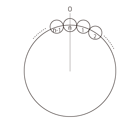 • 各フィボナッチ数n( =5, 8, 13, 21, 34, 55, ‥‥ ) に対し,黄金角のn回の回転で,円周にn個がほぼ等間隔に並ぶ。