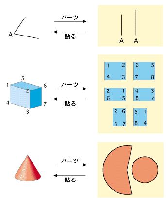- 「部品 (パーツ) の貼り合わせ」も,モノに対する幾何学的な見方のうちの一つです。