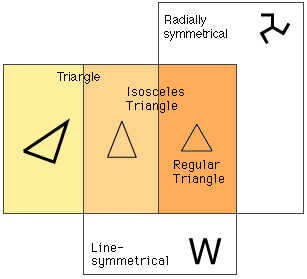 • ひとが対象化している三角形は,「二等辺三角形」,「正三角形」,「直角三角形」の3つですが,このうち「二等辺三角形」と「正三角形」は,「対称」を使ってつぎのように位置づけられます: