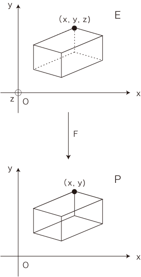 「3次元ユークリッド空間Eを,これの2次元超平面Pに,アフィン変換する。」
