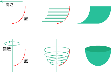 「回転形」は,「柱」の構成要素「底と高さ」のうちの「高さ」の方を,「回転軸と回転の大きさ」に置き換えたものになっています: