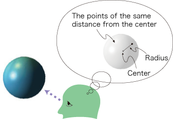 • 特に,「球面」を「1点Oから等距離にある点全体」と特徴づけることができます。そしてこの特徴づけの方が,操作・生産の面で都合がよいので,これが「球面」の定義に選ばれています。