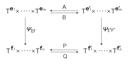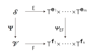 こうして,\( \Psi_{EF} \) はつぎのようになる: \[ \psi_{EF} : T^{{\bf e}_1} \times \cdots \times T^{{\bf e}_m} \longrightarrow T^{{\bf f}_1} \times \cdots \times T^{{\bf f}_n} \] \( \psi_{EF} \) からは,さらにつぎの n 個の関数が導かれる: \[ {\psi_{EF}}_{(k)} : T^{{\bf e}_1} \times \cdots \times T^{{\bf e}_m} \longrightarrow T^{{\bf f}_k} \ \ \ \ \ (\, k = 1, \cdots , n \,) \]