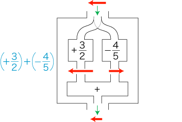 +3/2, -4/5 に対する「(+3/2)+(-4/5)」は,つぎのような入出力マシンになります: