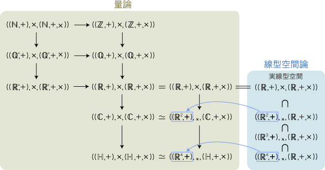 これらは,線型空間論の実線型空間から材料をとってきている。 特に,( ( , +), ×, ( , +, ×) ) は,「量」と「線型空間」の両方の見方ができる。