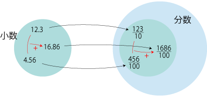 数学では,集合に構造を導入したものを,空間と呼ぶ。 空間に対しては,「部分空間」の概念が導入される。 「部分」の意味は,「集合の部分であって,空間の構造に関してそれ自体閉じている」である。 例えば,環Aに対して「Aの部分環」が考えられる。 これの意味は,「Aの部分集合であって,Aの環構造を定義している二つの算法──加法と乗法──に関して閉じているもの」である。 分数全体の集合は,乗法と加法の二つの算法で定義される構造をもつ空間になる。 小数全体の集合も,乗法と加法の二つの算法で定義される構造をもつ空間になる。 いま,「小数倍を分数倍に解釈」をやるときの小数と分数の対応で以て,小数の集合を分数の集合に埋め込む。 ![]()
