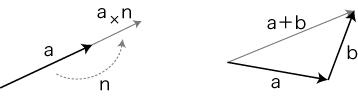 一般に,ベクトルにおいては,(1) ベクトルに対するスカラ(数) の倍作用と,(2) ベクトルの和が,つぎのように定義されています: