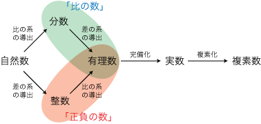 中学数学では,自然数・分数の「整数・有理数」への拡張が,「正負の数」の標題で指導内容になります。さらに後になって「実数」も加わります。