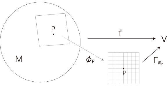 同様に,或るベクトル空間 \( V\) の要素を値にする関数が立っているときはベクトル場といい,或るテンソル積 \( T\) の要素を値にする関数が立っているときはテンソル場という。