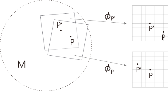 リーマン多様体 \( M\) は,点 \(P\) ごとに「\(P\) 近傍地図 \(\phi_P \)」が作成されている。