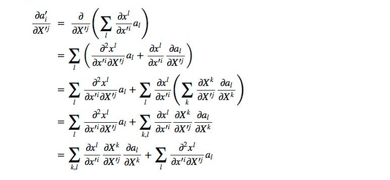 実際,つぎが成り立つ: \[ \begin{align*} \nabla'_j a'_i \ =\ \frac{\partial a'_i}{\partial X'^j} - \sum_k {\it \Gamma}^{\,'k}_{\ ij} a'_k \\ =\ \sum_{k,l} \frac{\partial x^l}{\partial x'^i} \frac{\partial X^k}{\partial X'^j} \nabla_k a_l \end{align*} \] 以下,これの計算過程を示す。 「共変座標」)