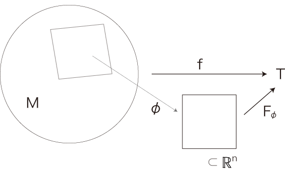 「ベクトル場」と「テンソル場」の間に「マトリクス場」をはさんだ。 そしてその理由を,「テンソルはマトリクスのことではないよ」を示しておくため,と述べた。 テンソルは,マトリクスの概念の拡張ではない。 マトリクスとは,線型写像の表現行列のことであった。 そして \(Hom(V,W)\) は,テンソル積 \(V^* \otimes W\) と同じことになる。 マトリクスに対応するテンソル積が \(V^* \otimes W\) だということは,テンソルがマトリクスの概念の拡張というものではないことを示す。 ただし,物理学・工学で「テンソル」と呼ばれているもののうちには,「テンソル積」とはならないものがある。 この場合,「加減乗除計算のワンパッケージ──計算公式」が「テンソル」と呼ばれていることになる。 そしてこのときは,一つの計算式 \(t\) に対し,座標変換で \(t\) になる計算式全体の集合が,上の図式の中の「\(T\) に該当する。 |