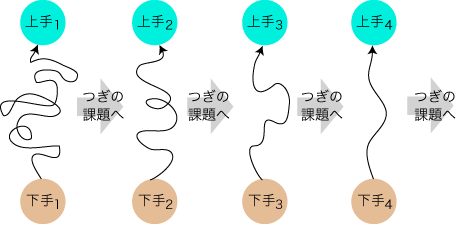 (「落ち着きがない」), すぐ他のことに目移りして,別のことを始める。 これの繰り返し。 これは,癖になる。いやゆる「避け癖」である。 「避け癖」がつくと,例えば「論文作成課題への取り組み」の場合だと,下手の連なりをつくる: ![]() ただし,当人は「達成」の経験がないので,上手を連ねていると思っている: ![]() 「避け癖」がいったんついてしまうと,これの矯正はひじょうに難しい。 自己矯正が難しいのはアタリマエだが,この場合は「指導」という形もうまく機能しない。 ──これは,つぎのように構造的なものである: