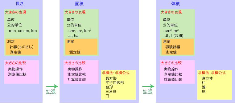 「長さ ─(類比)→ 面積」「長さ・面積 ─(類比)→ 体積」の観点から,面積指導では長さを既習として用い,体積指導では長さ・面積を既習として用いる: