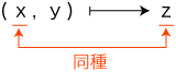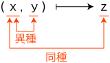 「×」の記号の使用は,「数 × 数」に限ります。 ──これが記号「×」の文法です。 そしてこの場合,つぎの形になります: 数学では,一般に,つぎの形の関数を「算法」と呼びます: そして,この「算法」につぎの2種類を考えます: