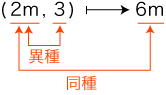 ![]() この定義を知ったところで,最初の「2m × 3 =6m」の表現に戻るとしましょう。 この表現は,「2m の3倍は6m」のつもりで書いたものです。 これは「長さ2m に数3を倍作用すると6m」ということで,外算法(作用) になります: 一方,「×」は,「乗法」と呼んでいる数の間の内算法(演算) の記号です。 よって,「2m × 3 =6m」の表現は,「×」の記号の文法違反です。 そこで,本サイトでは,量に対する数の倍作用を表す記号として「×」を用いるようにしています: