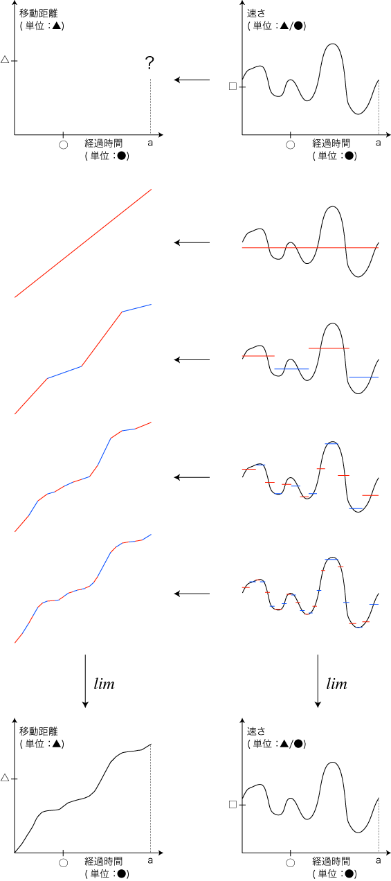 この手順を,式に表現してみる。 k番目の近似になるところの階段グラフを,Gk とする。 Gk において,各階段の幅の値と速さの値を,Δtk,vk (k=1, ‥‥, n) とするとき,Gk に対応する<時間─距離>の折れ線グラフのaにおける値は,つぎの式で求められる: