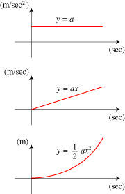 - 以下は,毎秒amずつ速度を上げるときの,言い換えると,加速度が「毎秒am毎秒 ((am/sec)/sec)」のときの,加速度,速度,移動距離それぞれを表すグラフです: