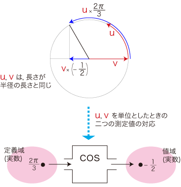 例えば cos(2π/3) =−1/2 となりますが,ここでの 2π/3 と −1/2 の対応はつぎのルールによって決められます:
