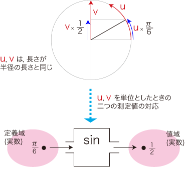 例えば sin(π/6) =1/2 となりますが,ここでの π/6 と 1/2 の対応はつぎのルールによって決められます: