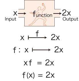 この入出力マシンを図と式 (記号列) で表現するならば,つぎのような,働きの名前「f」と入力容器の名前「x」を使うものになる (「2x」は「容器xに入っている数の2倍の数」の意味):