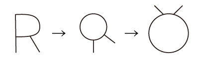 ルールは,「切らない限りの変形 (伸び縮みを含む) を無視」である。 「同じ形」は,切らない限りの変形 (伸び縮みを含む) を無視したものとする。 そこで,つぎのように変化する3つの形は,同じ形である: