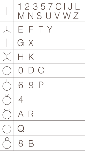 この方法で,アラビア数字「012345678」とローマ字「ABCDEFGHIJKLMNOPQRSTUVWXYZ」を同じ形に分けてみよう。 (このときの「同じ形」の目のつけどころは,端点と交差点(三叉路,四叉路)である。) 同じ形が,つぎのように分けられる: