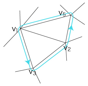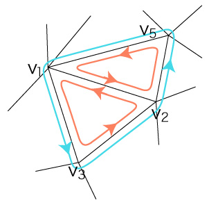 閉曲面における「周回が面の境界になっているかどうか」は,三角面複体では「サイクルが面の境界になっているかどうか」になる。 面の境界になっているサイクルを,バウンダリサイクルと呼ぶ。 「周回が面の境界になっているかどうか」は,ここに「サイクルがバウンダリサイクルかどうか」の表現を得る。 さて,サイクルがバウンダリサイクルかどうかは,面の表現ができてからの話である。 面は,辺を共有する三角形のつくる面である。 この面は,有向面にする必要がある。 サイクルが,\( \mathbb{Z} \) 加群 \( C_1 \) の要素として,有向だからである。 有向面を,頂点をたどる順番で表そう。 つぎのように: |