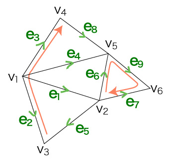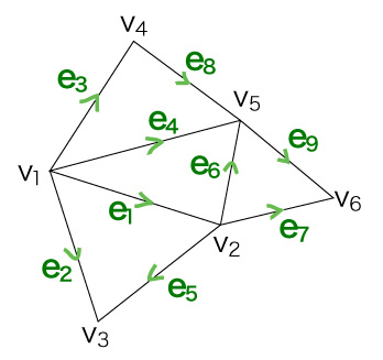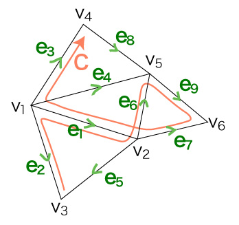 このとき,\( e_i = \overrightarrow{v_j v_k}\ \) の逆 \( \ \overrightarrow{v_k v_j}\ \) は \( - e_i \) となる。