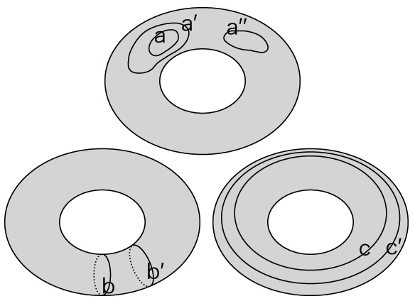 即ち,つぎの図で,aとa′とa′',bとb′,cとc′ はそれぞれ同タイプの周回の組だが,aとbとcは互いにタイプが異なる,というふうに見える: