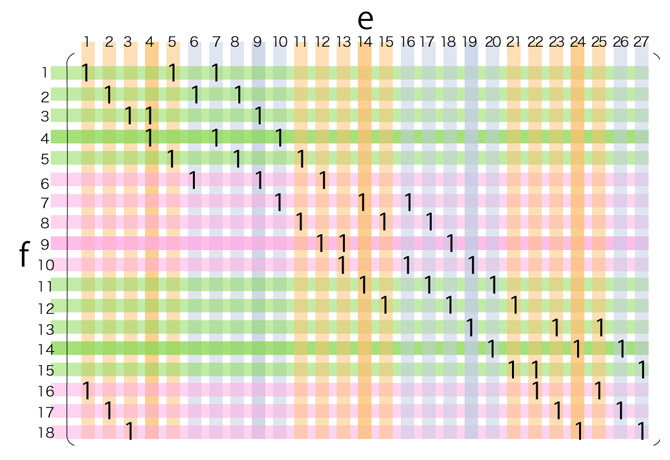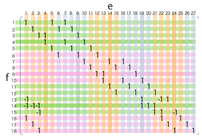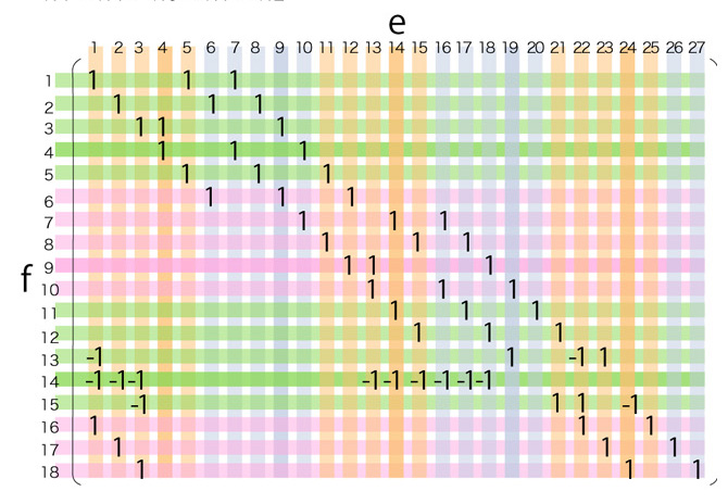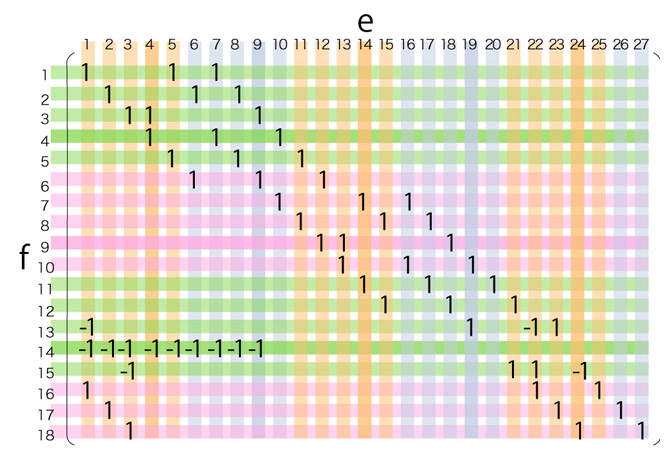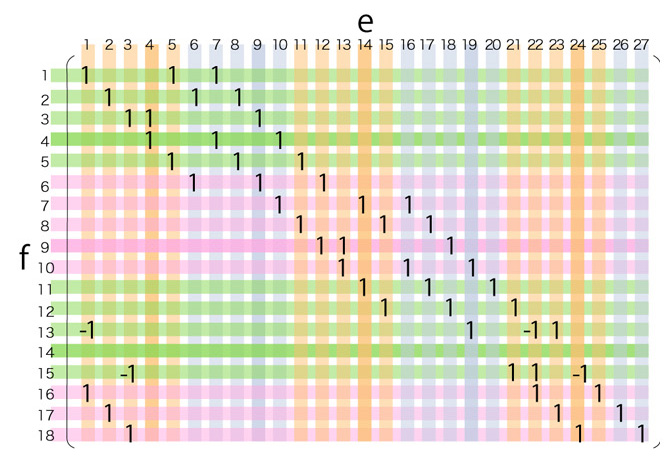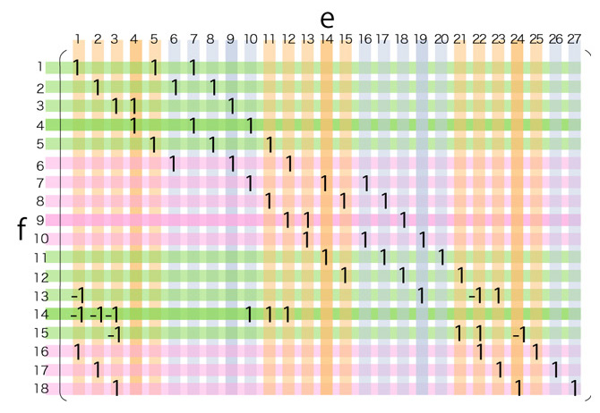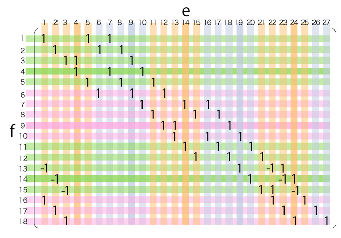 よって,基底 \( \{ f_k\}, \{ e_i \} \) に対する \( \partial_2 : C_2 \rightarrow C_1 \) の表現行列は,