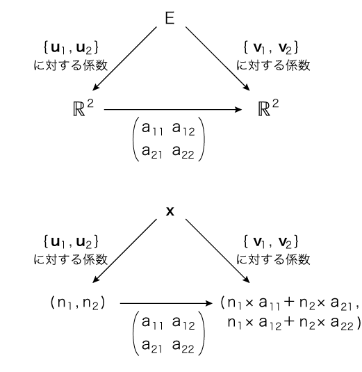 そこで,{u1, u2} から {v1, v2} への基底変更にともなうベクトルの新表現を求める計算を,つぎのように定めればよいことになる: