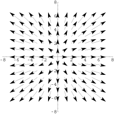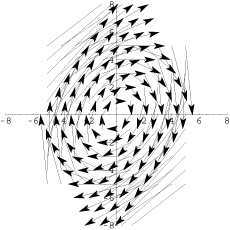 vector[ {x1_, y1_}, {x2_, y2_} ] := Module[ {sen, a, b, c1, c2, c11, c12, d1, d2, d11, d12, e1, e2, p}, sen = { Thickness[0.001], Line[ { {x1, y1}, {x2, y2} } ] }; a = x2 - x1; b = y2 - y1; c1 = -a Cos[15 Degree] + b Sin[15 Degree]; c2 = -a Sin[15 Degree] - b Cos[15 Degree]; c11 = x2 + c1 0.8/(Sqrt[c1^2 + c2^2] + 0.0001); c12 = y2 + c2 0.8/(Sqrt[c1^2 + c2^2] + 0.0001); d1 = -a Cos[-15 Degree] + b Sin[-15 Degree]; d2 = -a Sin[-15 Degree] - b Cos[-15 Degree]; d11 = x2 + d1 0.8/(Sqrt[d1^2 + d2^2] + 0.0001); d12 = y2 + d2 0.8/(Sqrt[d1^2 + d2^2] + 0.0001); e1 = x2 - 0.6 a/(Sqrt[a^2 + b^2] + 0.0001); e2 = y2 - 0.6 b/(Sqrt[a^2 + b^2] + 0.0001); p = Polygon[ { {x2, y2}, {c11, c12}, {e1, e2}, {d11, d12}, {x2, y2} } ]; Graphics[ {sen, p} ] ] vectorfield[ {{a11_,a12_},{a21_,a22_}} ] := Module[ {A}, A = { {a11,a12}, {a21,a22} }; Show[ Table[ vector[ {x1, y1}, {x1, y1}.A ], {x1, -5, 5}, {y1, -5, 5} ], Axes -> True, AspectRatio -> Automatic, PlotRange -> {{-8, 8}, {-8, 8}} ] ]