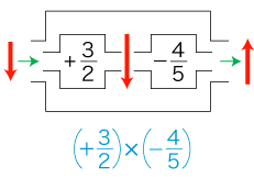 +3/2, -4/5 に対する「(+3/2)×(-4/5)」は,つぎのような入出力マシンになります: