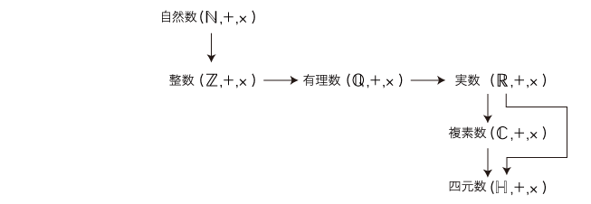 複数のカテゴリーがありますので,複数の数(系) が必要になります。 これをつぎのようにつくっていきます──矢線の意味は「導出・拡張」です:
