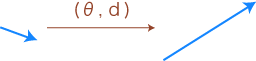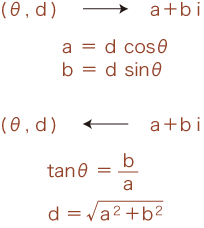 高校で複素数を習ったひとは,実はこの2つの表現とその換算法も学習しています。 (しかしほとんどのひとは,これの意味を知らないで/意識しないで過ごしてきています。) 複素数zの二つの表現a + biと (θ, d) に対し,zの偏角と呼ばれ arg(z) と表記されたのがθで,zの絶対値と呼ばれ |z| と表記されたのがdです。 そして以下が,換算法です: ![]() |