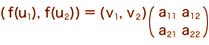 このとき,{ u1, u2 } に対する値が ( n1, n2) の x に対し,{ v1, v2 } に対する f( x ) の値は,つぎのようになります:
