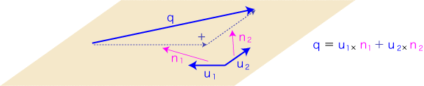直線上の移動/シフトは,単位の何倍という形で記述できました。これに対し平面上の移動/シフトの場合,「数」ではなく「スカラー」で表現を行おうとすると,単位は成立しません。 単位の役割をさせるものとして,向きの異なる2つのベクトルの組 (u1, u2) を用いることになります。
