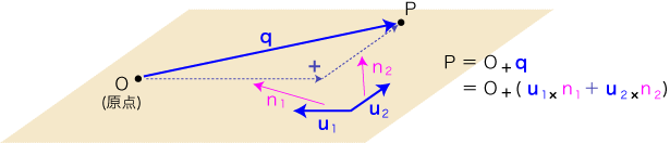 なお,点の表現の枠として用いている基底と原点の組──2次元の場合だと ( (1, 2), O ) ──を,「(アフィン)枠」と呼びます。