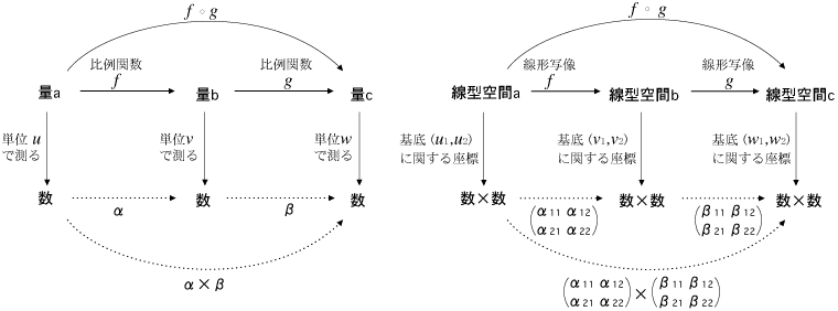 - 線型写像の合成は,以下述べるように,表現行列の積の計算によって求めることができます。そしてこのときの行列の積は,比例定数の積とつぎのように対応しています: