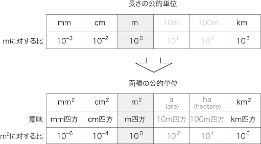 面積の公的単位は,長さの公的単位をもとにします。 すなわち,