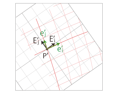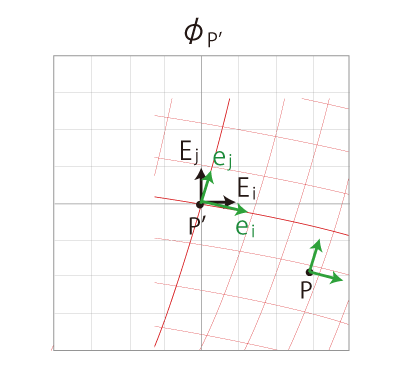 \({X'}^i \) 座標に伴う曲線座標を,\({x'}^i\) 座標と呼び,これの基底──局所直線基底──を,