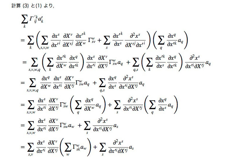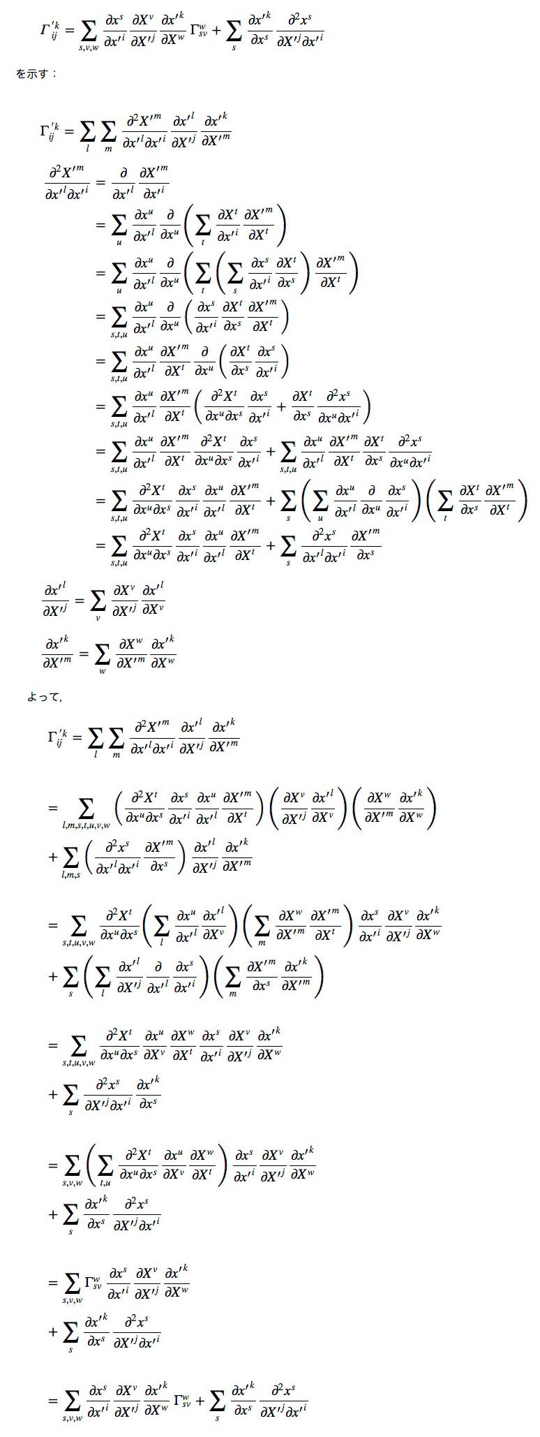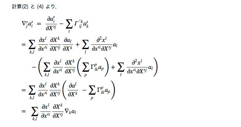 実際,つぎが成り立つ: \[ \begin{align*} \nabla'_j a'_i \ =\ \frac{\partial a'_i}{\partial X'^j} - \sum_k {\it \Gamma}^{\,'k}_{\ ij} a'_k \\ =\ \sum_{k,l} \frac{\partial x^l}{\partial x'^i} \frac{\partial X^k}{\partial X'^j} \nabla_k a_l \end{align*} \] 以下,これの計算過程を示す。 「共変座標」)