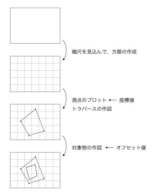 トラバース線に対し,オフセット測量で定位した点および線を書き加える。