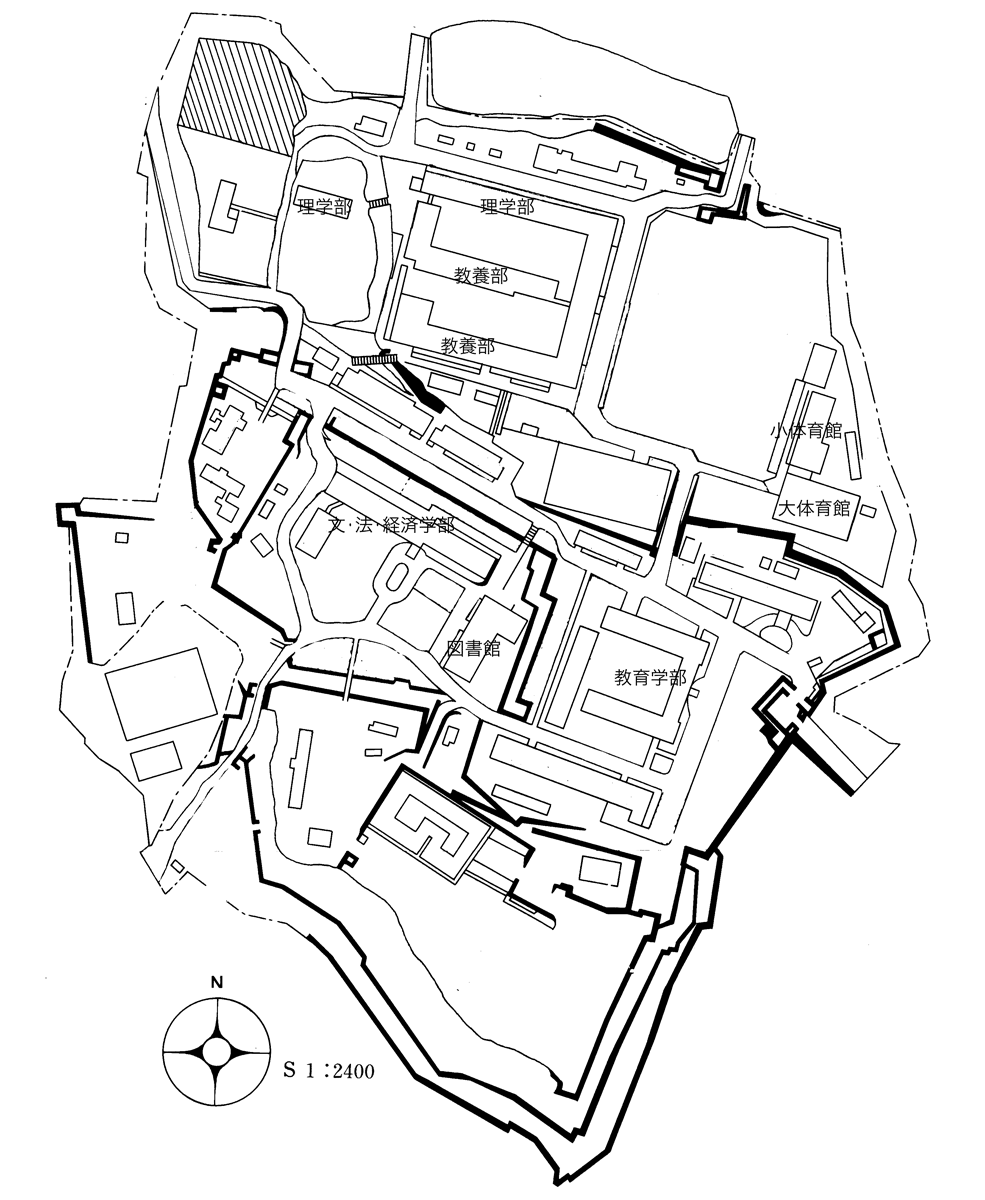 授業では,最初の何年かは,測量対象を大学の中のつぎの3つの区域にして,班ごとに担当区域を割り当てた: